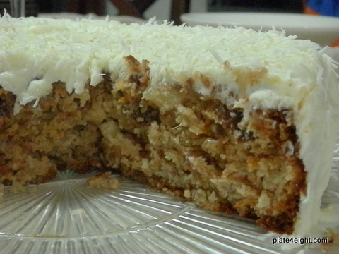 Now it’s no secret that I love nuts, but Mr8 isn’t fussed on nuts in cakes, so I substituted sultanas for the walnuts and toasted up some shredded coconut to sprinkle on the top. I wanted flaked coconut, but for some reason I couldn’t get it anywhere, but the shredded worked out nicely. You have to be really patient and careful when you are toasting your coconut. You need to keep it on a really low heat and stand there patiently tossing it around the pan, wondering if it will ever start to change colour, but when it does, Look Out!, because when the oil in that coconut heats up it really takes off and easily burns, so you need to watch it really carefully. My dream cake of course would have been surrounded by a wall of crushed walnuts. Maybe next time.