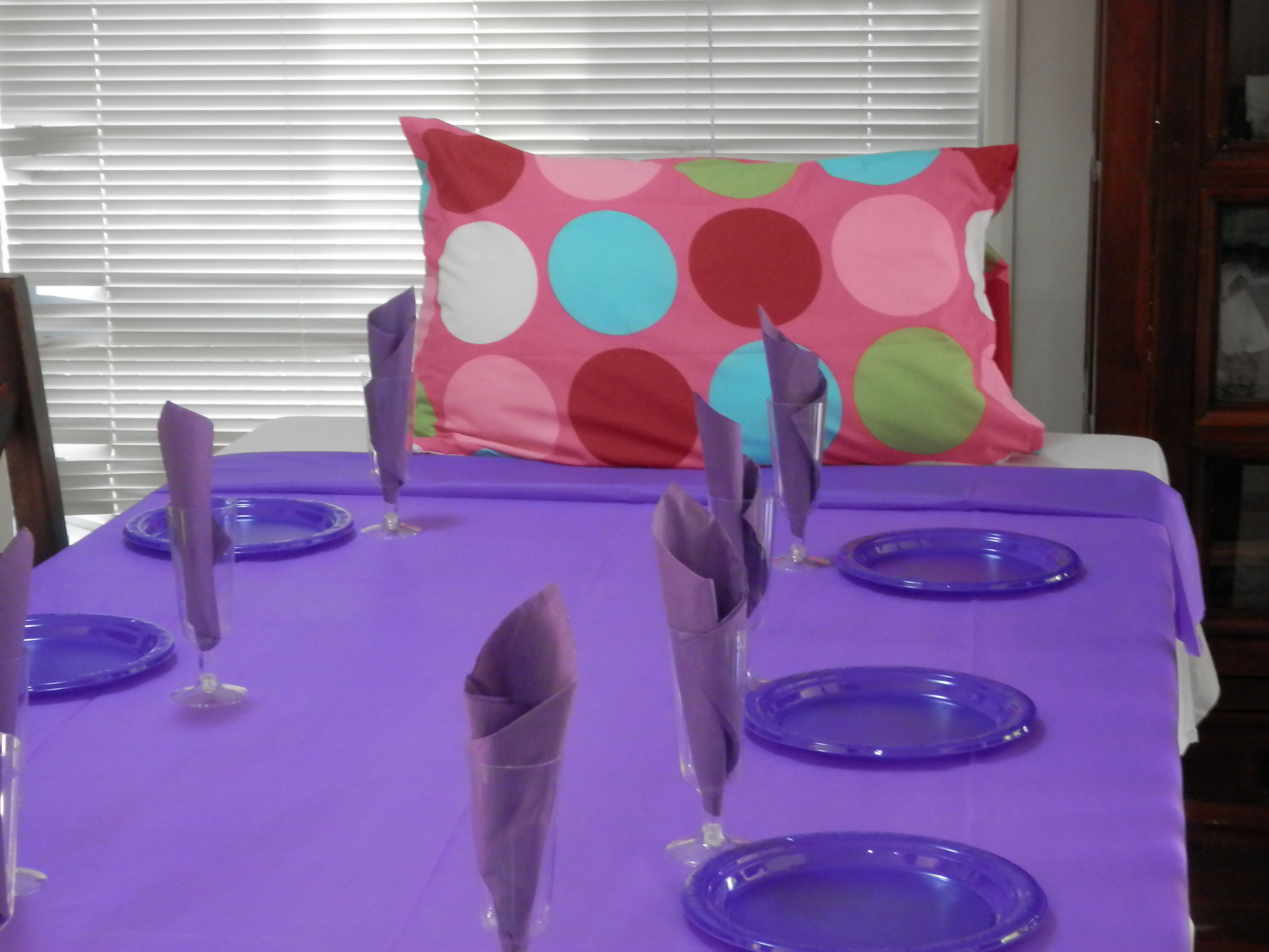 The table was decorated to look like a bed. I considered using fabric for the bedspread, but when I took into consideration all of the pizza etc they were going to eat and get all over it, I decided to use a white sheet for the bottom sheet and a purple plastic table cloth over the top for the bedspread. I popped a pillow and some teddy bears at the end of the table to make it look like a bed. And the table was set with plastic champagne glasses to give it a bit of a grown-up party feel for the girls. And to tell you the truth I think they noticed the glasses more than the fact that the table looked like a bed! Maybe it was one of those things we mums do to make ourselves happy, but the kids don’t really care one way or another about.