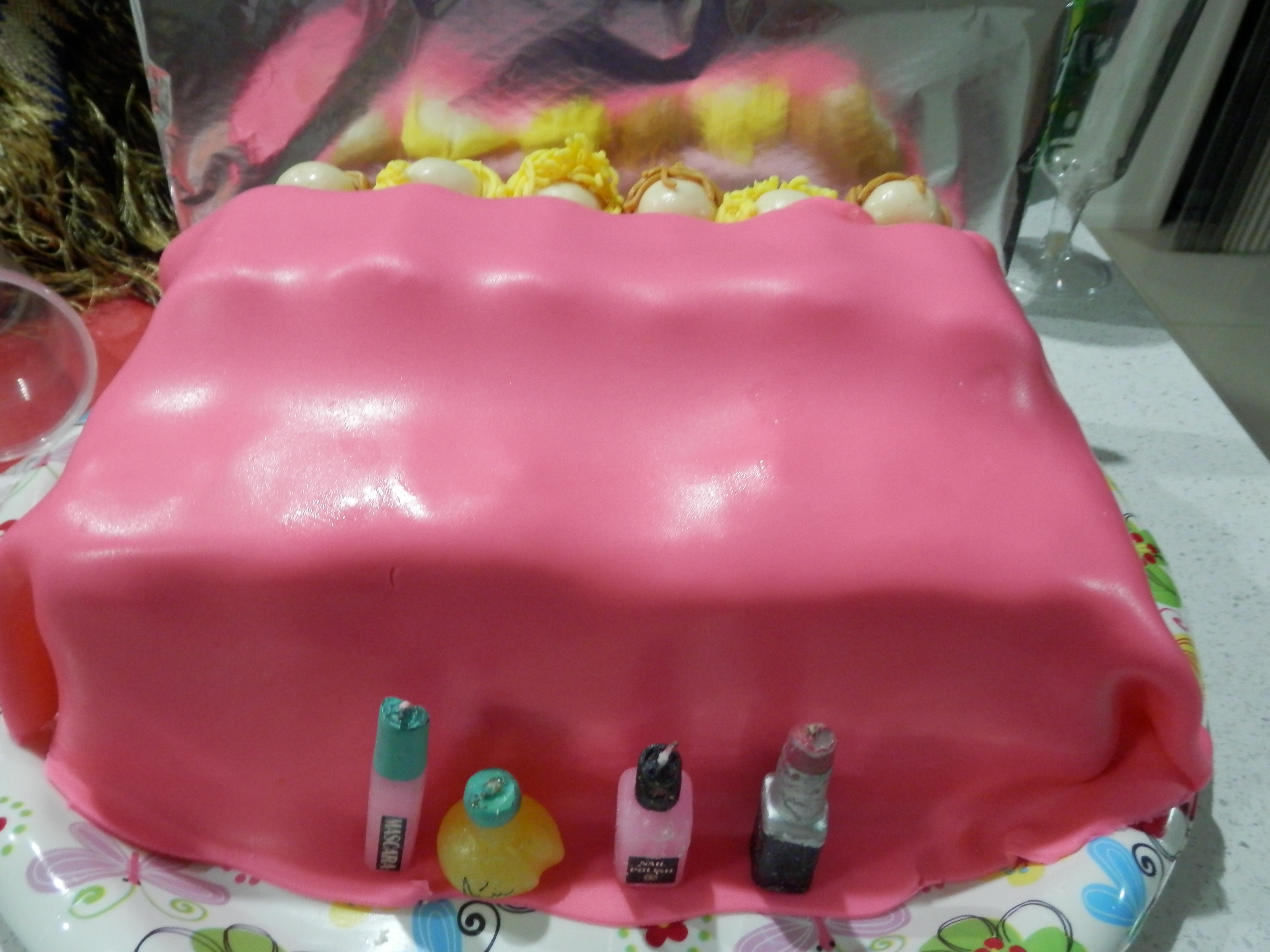 All of my carefully laid plans took a back seat to sick kids and doctor’s visits that week, but I managed to get everything done before the party (apart from the decorating of the cake) and when the girls arrived they had an impromptu disco in the media room (fancy name for the formal lounge) which was the room we designated for the slumber party. Some of the mums stayed for a while and chatted with me in the kitchen while I finished off the cake which was a large bed with six little girls sleeping in it. I had all sorts of plans to decorate it, but I ran out of time and at the last minute Miss 10 decided she wanted it to have a pink bedspread on it instead of a white one with pink hearts, and without thinking I coloured all of my fondant pink, and I didn’t have time to make another batch, so I couldn’t finish it off with white love hearts. I had also forgotten about a bedhead, so I made one out of cardboard and covered it in foil which looked ok, but overall I was pretty disappointed with the final result. I felt that it just wasn’t finished. But the girls loved it, especially when I remembered I had make-up candles of mascara, lipstick, a perfume bottle and nail polish. And for some reason, they all wanted to eat one of the heads! Talk about a sugar overload.