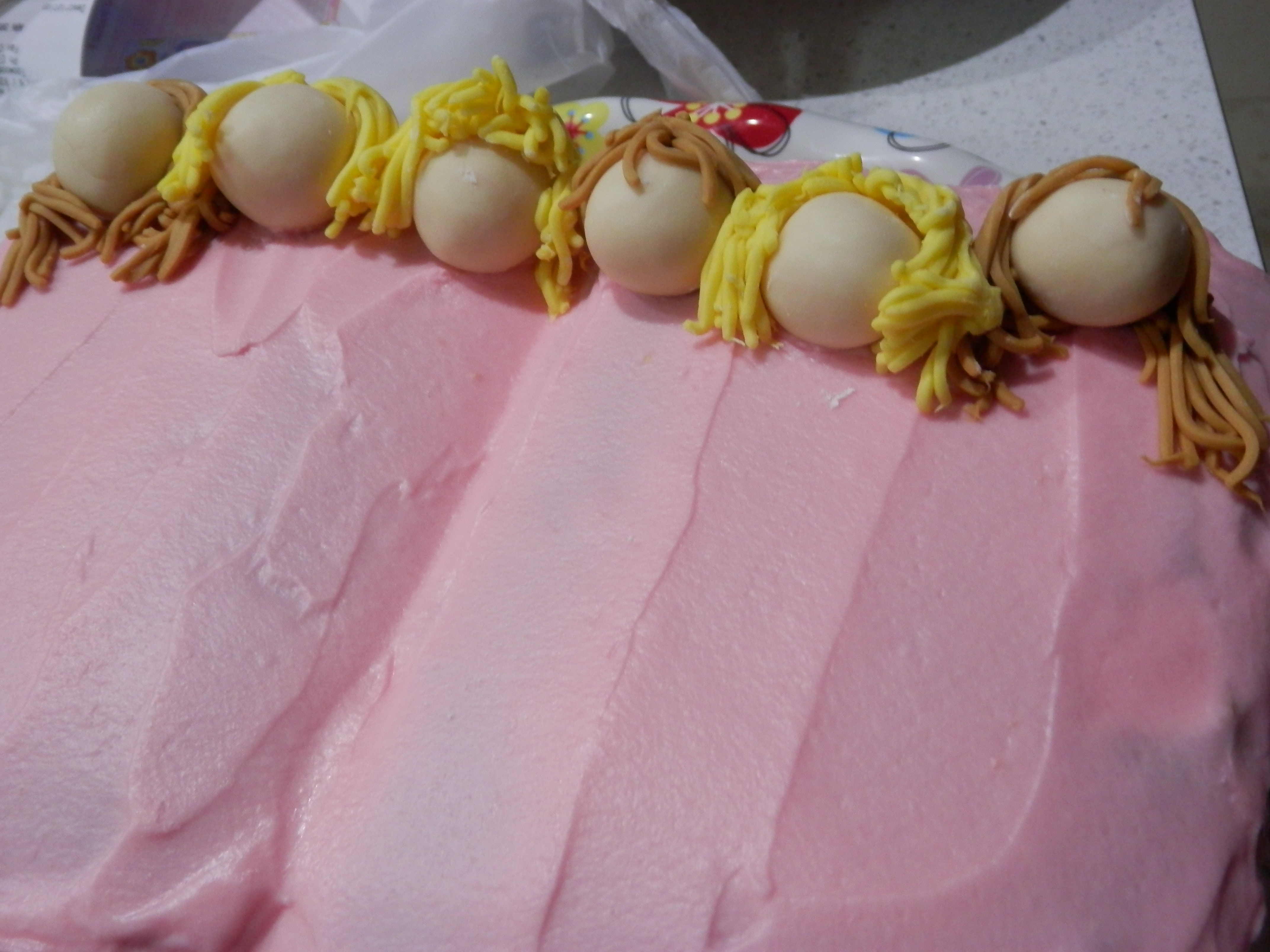 It really was an easy cake to make. I’ve never made people out of fondant before, but that was probably the easiest part. After I spent half a day searching all over town for a garlic press to make the hair, my friend Helena found one, bought it for me and turned up at school that afternoon telling me it was her gift to me. I’m very lucky to have such a thoughtful friend. I used little jam rolls for the bodies under the covers, I just sliced the bottom off the rolls so they weren’t too high and laid them in a row, coloured my fondant, rolled it out into a large rectangle and draped it over the cake that I had baked and iced with light pink buttercream frosting the night before. I also made the heads the night before. See: