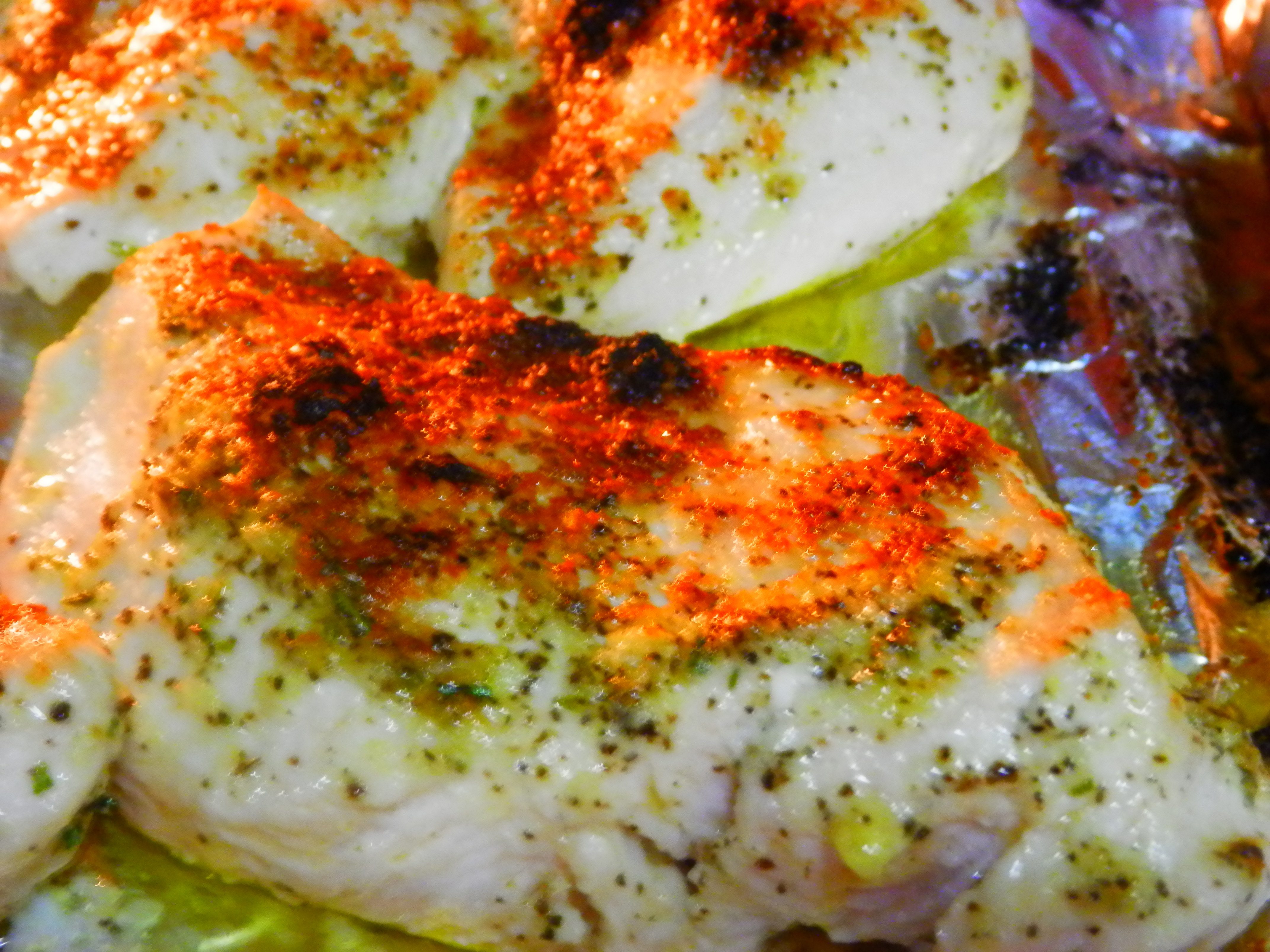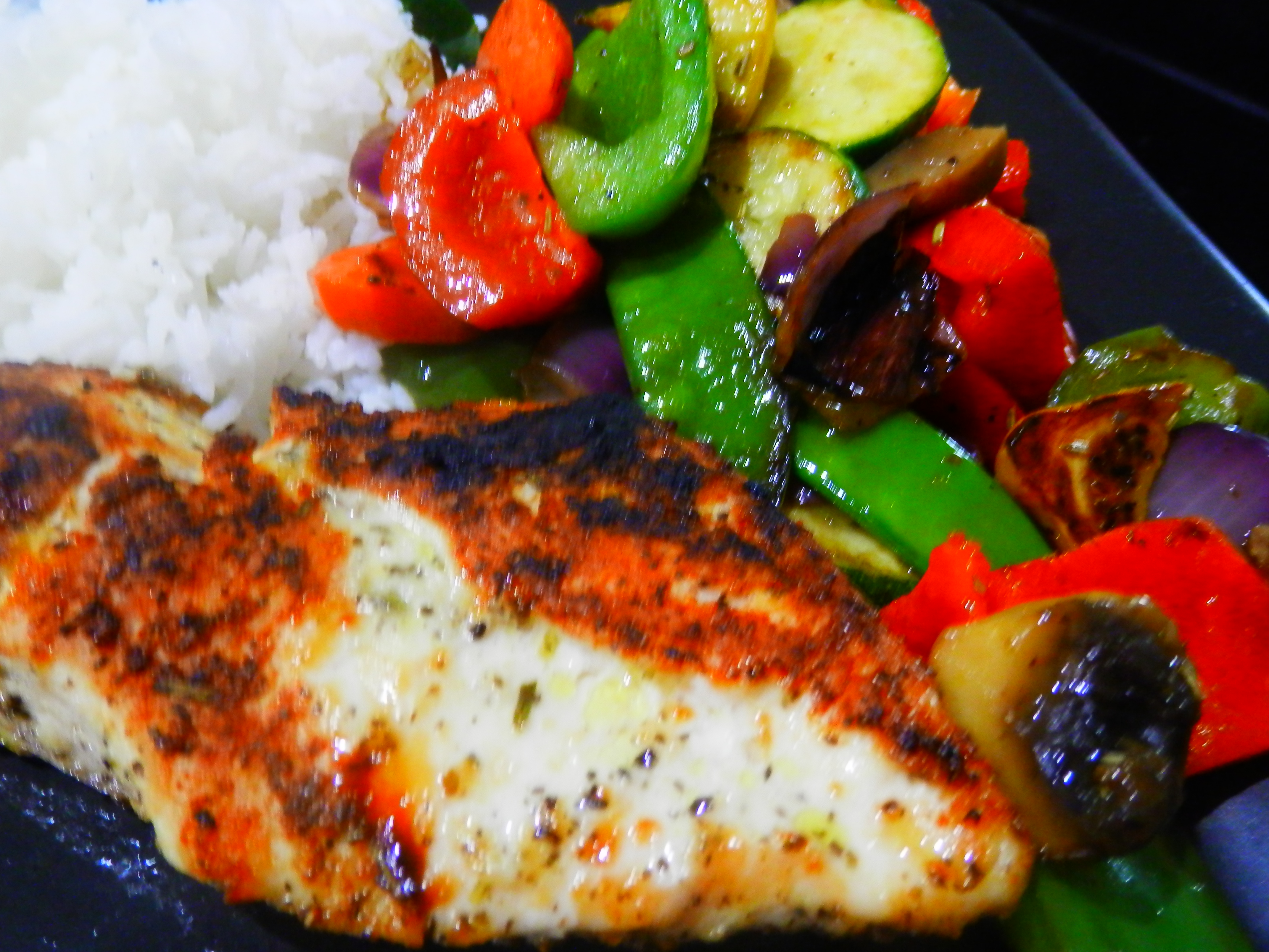 Coat both sides of the chicken breasts generously with the marinade and place in the refrigerator while you chop the veges.