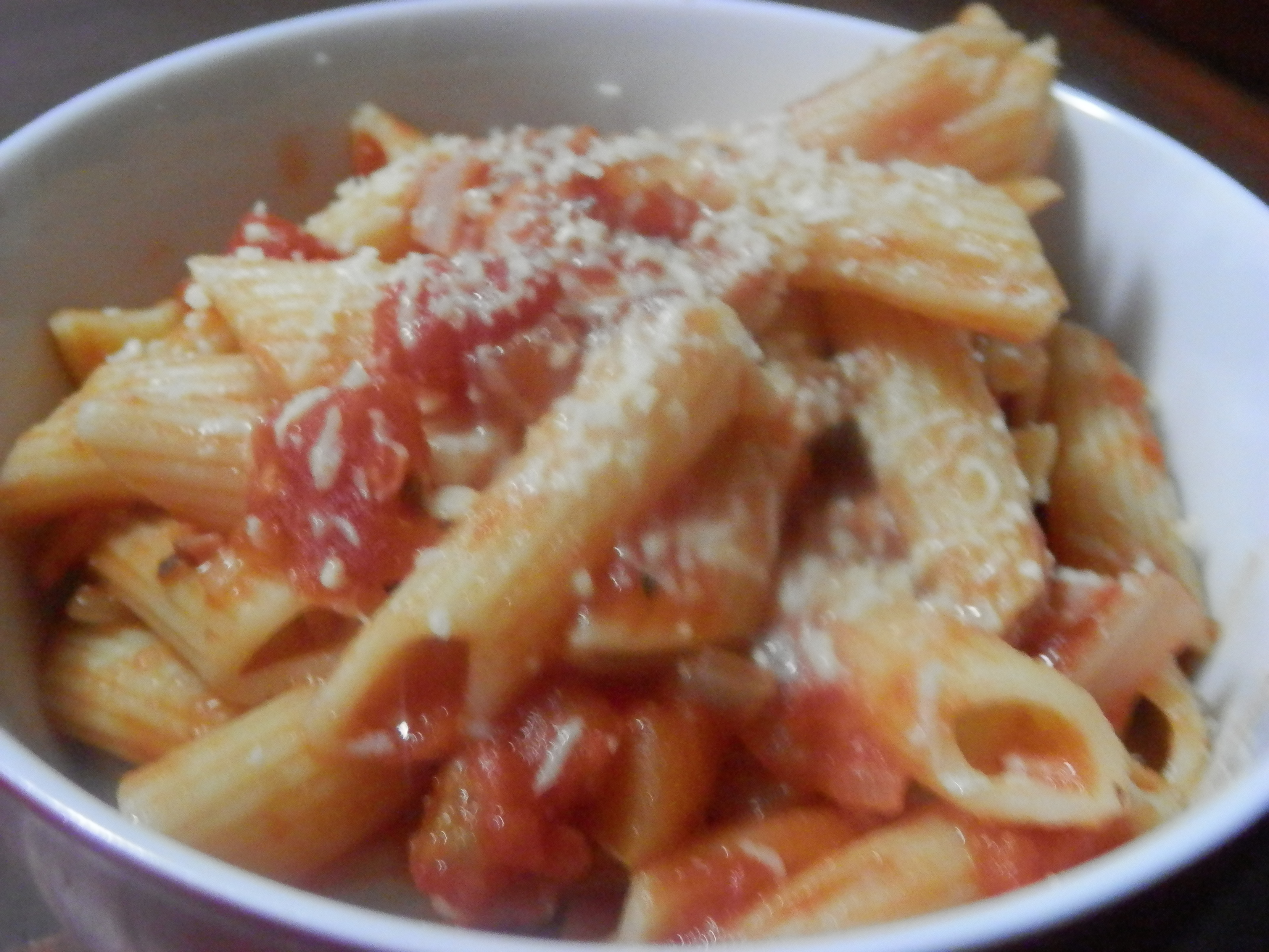 After you have drained the pasta, add it to the tomato sauce along with the parmesan cheese and stir to combine.