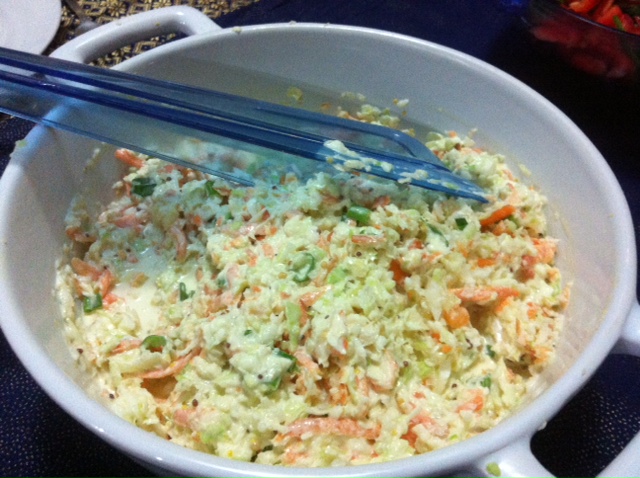 Every good BBQ needs a great coleslaw dish. I generally find coleslaw recipes to be a bit hit and miss, and bought coleslaw tastes like vinegar, but the dressing I have used in this dish adds a bit of sweetness and it got a thumbs up from my family. It will be perfect for the BBQ’s and picnics we’re trying to cram in while this beautiful weather holds out. I have only used white cabbage because that’s all I could get my hands on at the shops today, but that’s ok, because I think the kids find the red cabbage a bit too bitter for their liking.